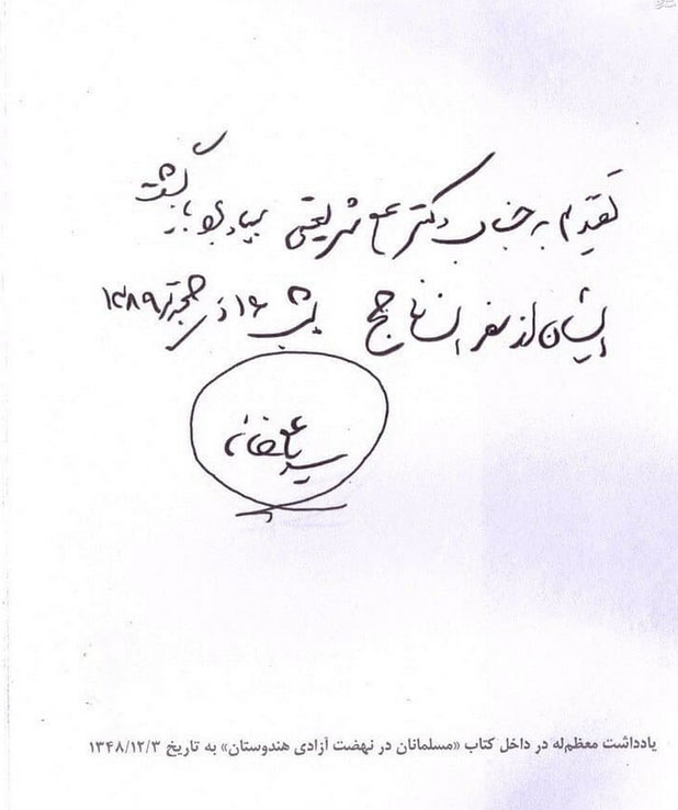 آیتالله العظمی خامنهای حدود ۵ سال پس از قیام ۱۵ خرداد در سال ۱۳۴۸ (۱۶ ذیحجه ۱۳۸۹ هجری قمری) کتاب «مسلمانان در نهضت آزادی هندوستان» را که نوشته خود ایشان بود به دکتر شریعتی هدید دادند.