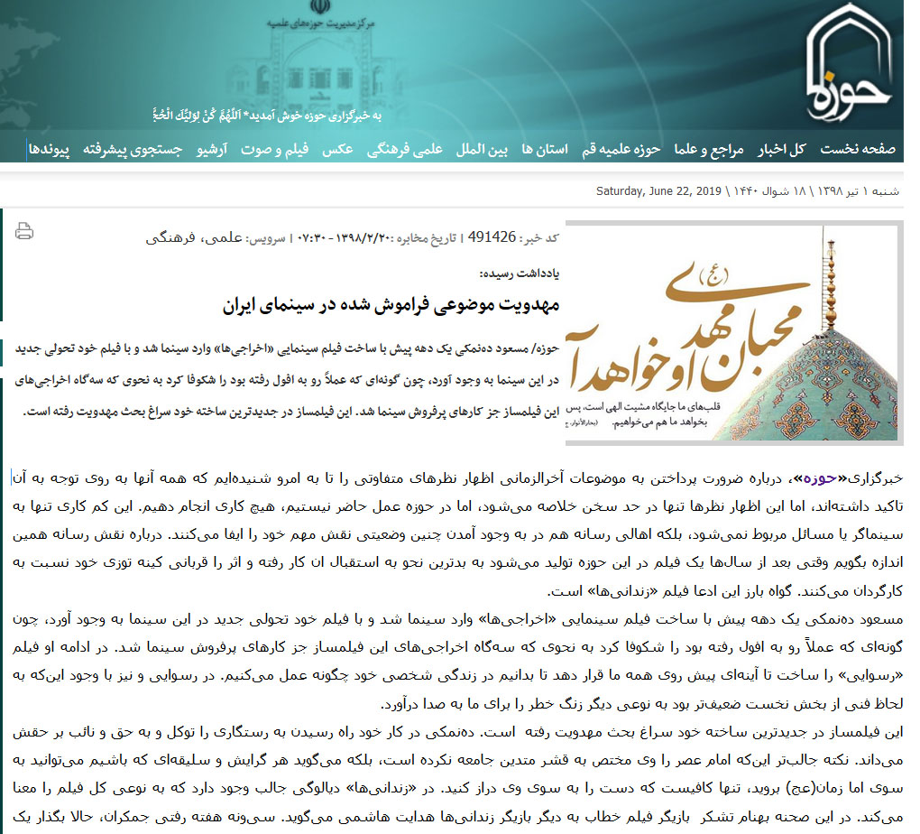 مسعود دهنمکی یک دهه پیش با ساخت فیلم سینمایی «اخراجیها» وارد سینما شد و با فیلم خود تحولی جدید در این سینما به وجود آورد، چون گونهای که عملاً رو به افول رفته بود را شکوفا کرد به نحوی که سهگاه اخراجیهای این فیلمساز جز کارهای پرفروش سینما شد. این فیلمساز در جدیدترین ساخته خود سراغ بحث مهدویت رفته است. |