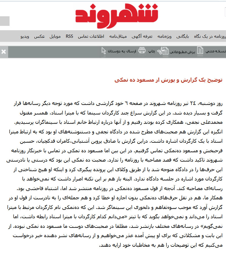 روز دوشنبه، ٢٤ تیر روزنامه شهروند در صفحه ٦ خود گزارشی داشت که مورد توجه دیگر رسانهها قرار گرفت و بسیار دیده شد. در این گزارش سراغ چند کارگردان سینما که با میترا استاد، همسر مقتول محمدعلی نجفی، همکاری کرده بودند رفتیم و از آنها درباره ارتباط خانم استاد با سینماگران پرسیدیم. انگیزه این گزارش هم صحبتهای مطرح شده در دادگاه نجفی و دستنوشتههای او بود که به ارتباط میترا استاد با یک کارگردان اشاره داشت. دراین گزارش با صادق پروین آشتیانی،کامران قدکچیان، حسین فرحبخش و مسعود دهنمکی تماس گرفتیم. در این بین اما مسعود ده نمکی در تماس با خبرنگار روزنامه شهروند تاکید داشت که قصد مصاحبه با روزنامه را ندارد. صحبت ده نمکی این بود که درستی یا نادرستی این حرفها را در دادگاه متوجه شد یا از طریق وکلای این پرونده پیگیری کرد و اینکه او هیچ شناختی از کارگردان مورد اشاره در جلسه دادگاه ندارد. البته باز هم بر این نکته اصرار داشت که نمیخواهد با رسانهای مصاحبه کند. آنچه از قول مسعود دهنمکی در روزنامه منتشر شد اما، اشتباه فاحشی بود. همکار ما، هم در نقل حرفهای دهنمکی بدون اجازه او خطا کرد و هم جملهای را به نادرست از قول او در گزارش آورد که موجب سوءتفاهم و دلخوری این سینماگر شد. این که دهنمکی نام کارگردان مرتبط با میترا استاد را میداند و نمیخواهد بگوید که با تیتر «میدانم کدام کارگردان با میترا استاد رابطه داشت، اما نمیگویم» در رسانههای مختلف بازنشر شد، مطلقا در صحبتهای دوست ما مسعود ده نمکی نبوده. از این بابت و مشکلاتی که برای او پیش آمده عذر میخواهیم و از رسانههای نشر دهنده خبر درخواست میکنیم که این توضیحات را هم به مخاطبان خود ارایه دهند.