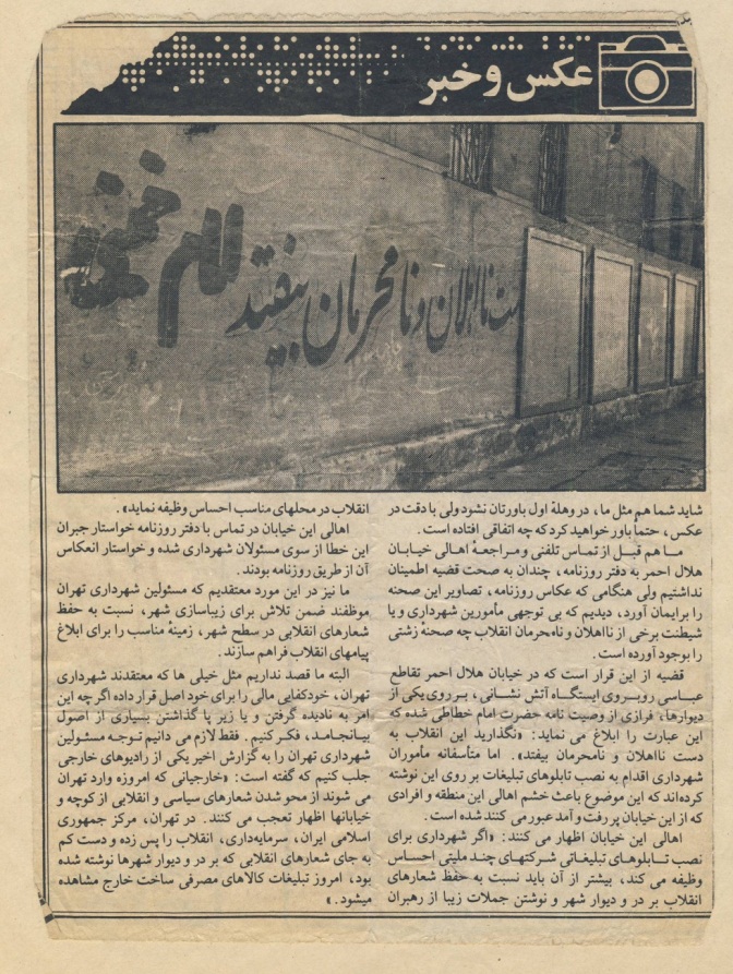 در کنار مبارزه شبانه ما گاهی مطالبی انتقادی در بخش اخبار ویژه روزنامههای جمهوری و کیهان آن زمان درج میشدند که، «عدهای به اسم دفاع از ارزشها با بیسلیقگی و بدخطی روی دیوارها، شعارهای انقلابی مینویسند که این بیسلیقگی باعث دلزدگی مخاطب میشود.» درواقع این روزنامهها خط بد دولت و شهرداری را نمیدیدند؛ ولی بدخطی ما را میدیدند. حالا سهواً یا عمداً متوجه نمیشدند که در کشور چه وارونگی فرهنگیای دارد روی میدهد.