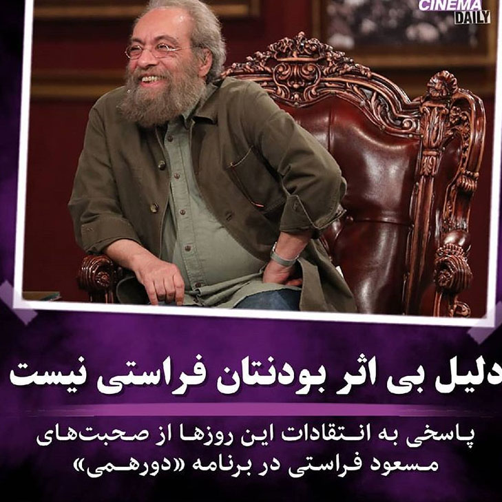 دو- همهاش جعل است. همهاش دروغ است. میگویند فراستی مدافع سهگانهی اخراجیها بوده. کِی؟ کجا؟ چه تاریخی؟ هیچ منتقدی به اندازهی فراستی اخراجی۳ را نکوبید و هیچ منتقدی همچون او، روی آنتن زندهی تلویزیون، به مناظره و جدلِ با مسعود دهنمکی نرفت. میگویند فراستی حامی قلادههای طلا بوده. کِی؟ کجا؟ چه تاریخی؟ فراستی روی آنتن زندهی تلویزیون، به صراحت عنوان داشت که قلادههای طلا کارگردانیاش خوب است اما فیلم خوبی نیست، زیرا شخصیتهای منفیِ قلادههای طلا، درنیامدهاند و مصنوعی و مقوّا هستند.